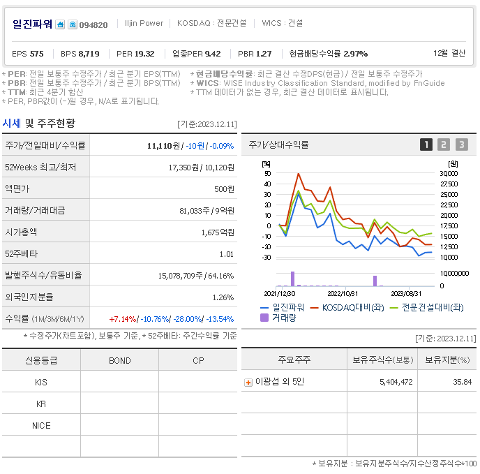일진파워 현재 주가는 11,110원이며 전일 대비 -10원의 모습을 보이고 있습니다. 일진파워의 주주현황을 살펴보면 이광섭(외 5인)이 지분 35.84%를 소유하고 있습니다. 일진파워는 에너지 시설 및 서비스 기업으로 장중 기준으로 주가는 11,110원 입니다. 삼성전자의 시가 총액은 1671억 원이며 발행 주식수는 1.26주 입니다.
