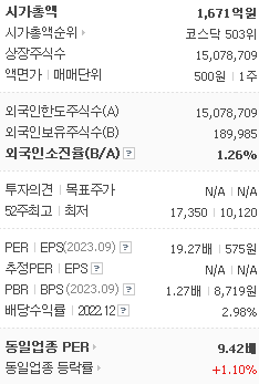 외국인 보유 비중은 81,033% 이며 장중 거래량은 15,078,709를 기록했습니다. 매출액은 1,403억 원, 영업이익은 179억 원을 달성했습니다. EPS는 없음원이며 일진파워 주식 배당수익률은 3.31% 입니다.