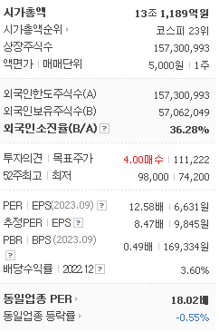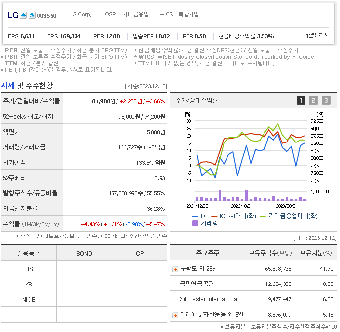 외국인 보유 비중은 166,727% 이며 장중 거래량은 157,300,993를 기록했습니다. 매출액은 54,102억 원, 영업이익은 19,414억 원을 달성했습니다. EPS는 9,845원이며 LG 주식 배당수익률은 3.84% 입니다.