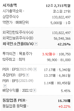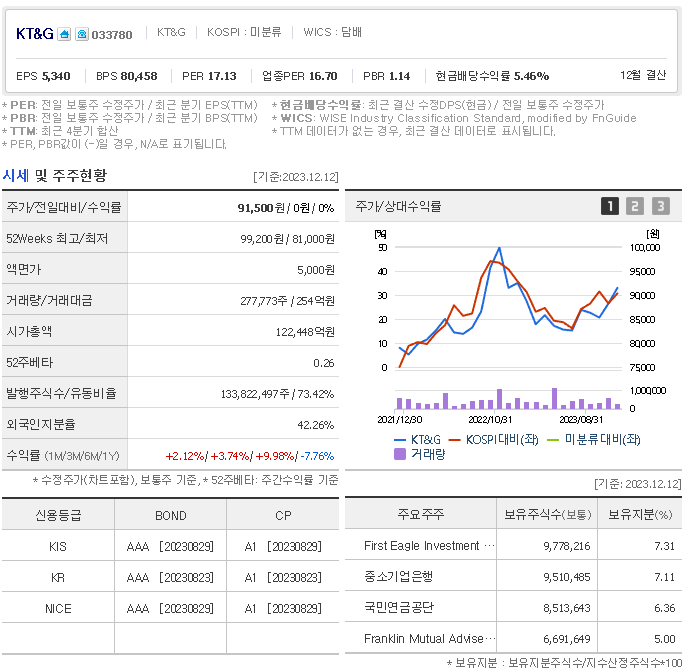외국인 보유 비중은 277,773% 이며 장중 거래량은 133,822,497를 기록했습니다. 매출액은 44,212억 원, 영업이익은 12,677억 원을 달성했습니다. EPS는 6,861원이며 KT&G 주식 배당수익률은 5.46% 입니다.