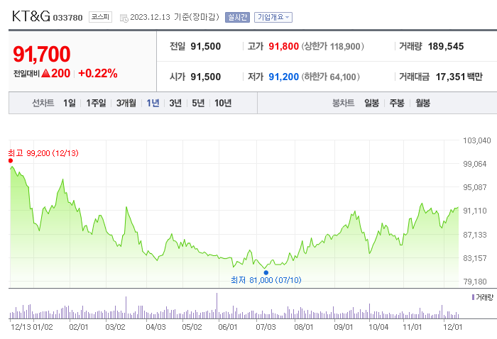 이 글에서는 KT&G 주가 전망과 목표 주가, 기업 정보에 대해서 설명합니다. 주식 투자에서 핵심은 미래의 기업 가치를 예상하고 선제적으로 움직이는 것입니다. 투자 대상을 결정하기 전에 현재 기업의 현황과 수치를 검토하는 것이 필요합니다. KT&G 주식의 주요 현황과 투자 정보를 확인하시고 주식 투자에 도움을 줄 자료들을 모아 두었으니 투자 결정에 도움을 받으시길 바랍니다.