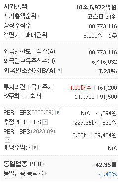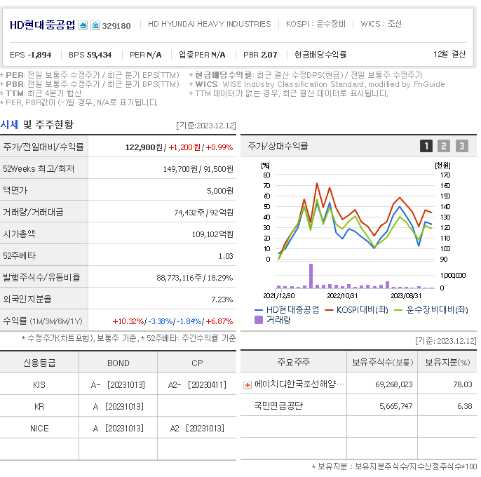 HD현대중공업 현재 주가는 122,900원이며 전일 대비 -3.38원의 모습을 보이고 있습니다. HD현대중공업의 주주현황을 살펴보면 에이치디한국조선해양(외 2인)이 지분 78.03%를 소유하고 있습니다. HD현대중공업는 조선 기업으로 장중 기준으로 주가는 122,900원 입니다. 삼성전자의 시가 총액은 10조6972억 원이며 발행 주식수는 7.22주 입니다.
