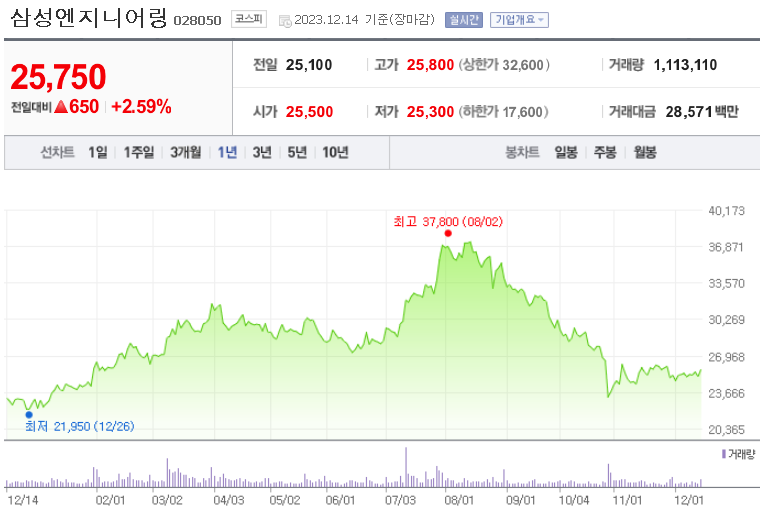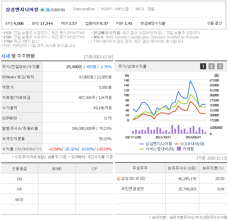 삼성엔지니어링 현재 주가는 25,100원이며 전일 대비 -450원의 모습을 보이고 있습니다. 삼성엔지니어링의 주주현황을 살펴보면 삼성SDI(외 6인)이 지분 20.53%를 소유하고 있습니다. 삼성엔지니어링는 건설 기업으로 장중 기준으로 주가는 25,100원 입니다. 삼성전자의 시가 총액은 5조176억 원이며 발행 주식수는 50.35주 입니다.
