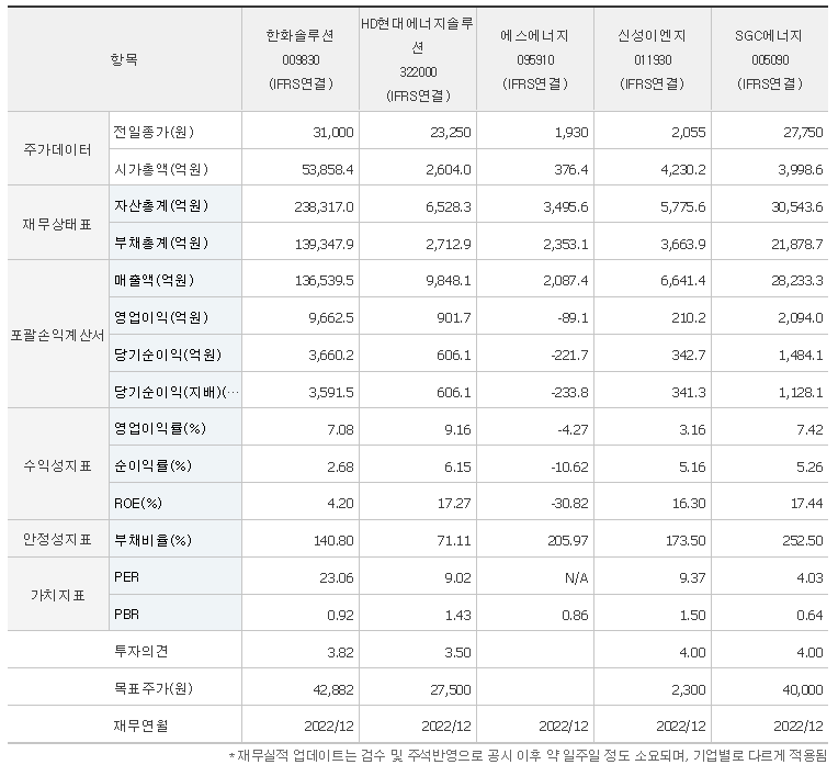 -2023년 6월 전년동기 대비 연결기준 매출액은 6.3% 증가, 영업이익은 11.1% 증가, 당기순이익은 63.7% 감소. 태양광 산업은 선벨트 지역 국가를 중심으로 정부의 보조금 지원 없이도, 기존 에너지원 대비 경제성 및 경쟁력이 크게 개선되고 있음. 동사의 태양관 산업은 파리 기후 협약 등 기후 및 환경에 대한 친환경 에너지 육성 정책에 힘입어, 중장기적으로 성장이 예상됨.
