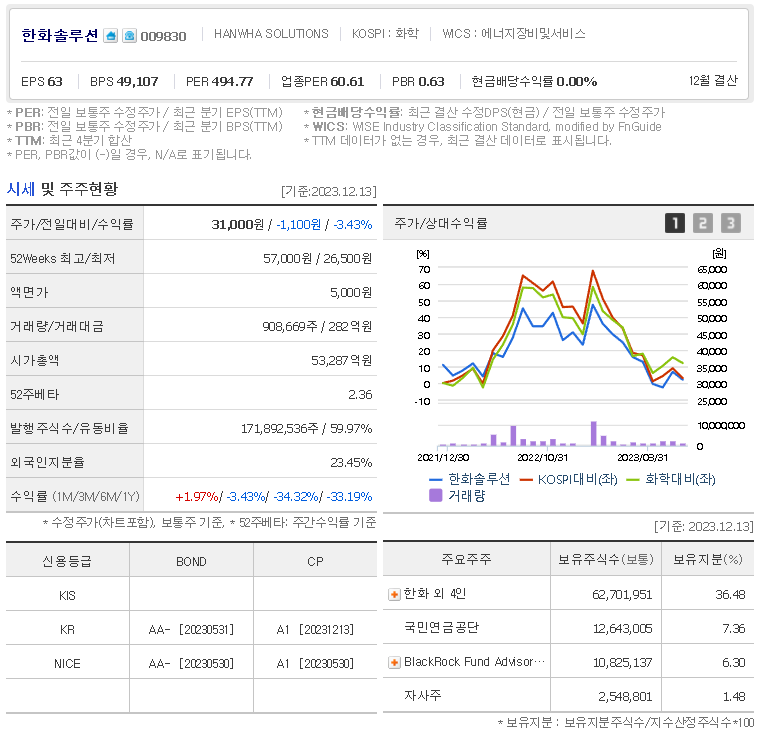 외국인 보유 비중은 908,669% 이며 장중 거래량은 171,892,536를 기록했습니다. 매출액은 94,190억 원, 영업이익은 9,662억 원을 달성했습니다. EPS는 1,231원이며 한화솔루션 주식 배당수익률은 % 입니다.