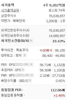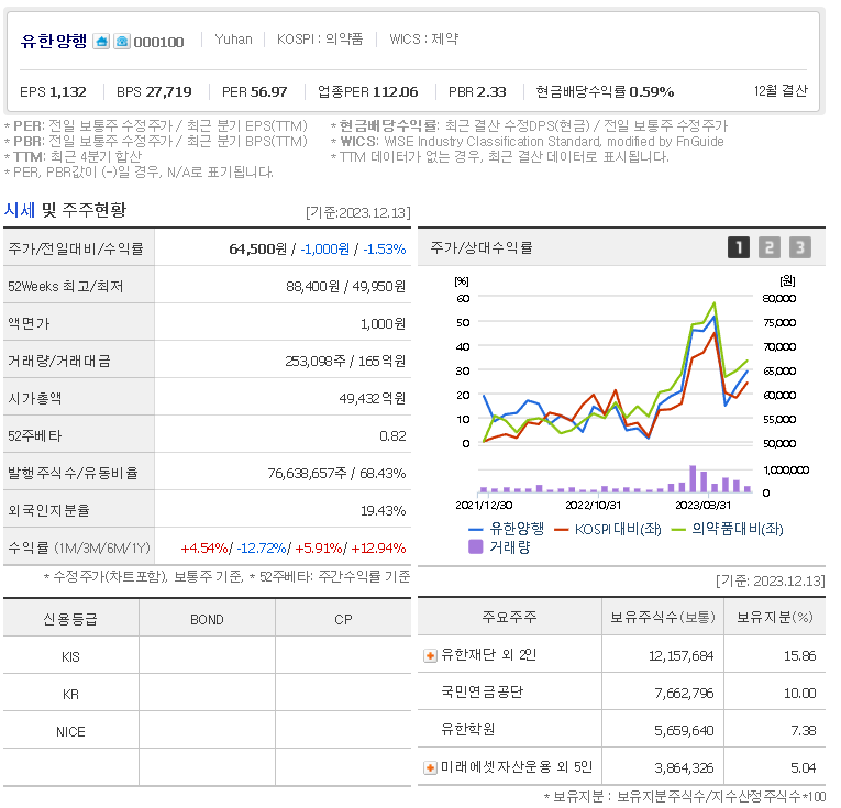 외국인 보유 비중은 253,098% 이며 장중 거래량은 76,638,657를 기록했습니다. 매출액은 14,218억 원, 영업이익은 360억 원을 달성했습니다. EPS는 1,100원이며 유한양행 주식 배당수익률은 0.67% 입니다.