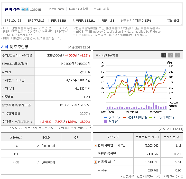 한미약품 현재 주가는 333,000원이며 전일 대비 원의 모습을 보이고 있습니다. 한미약품의 주주현황을 살펴보면 한미사이언스(외 2인)이 지분 41.42%를 소유하고 있습니다. 한미약품는 제약 기업으로 장중 기준으로 주가는 333,000원 입니다. 한미약품의 시가 총액은 4조1267억 원이며 발행 주식수는 16.50주 입니다.
