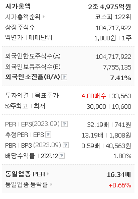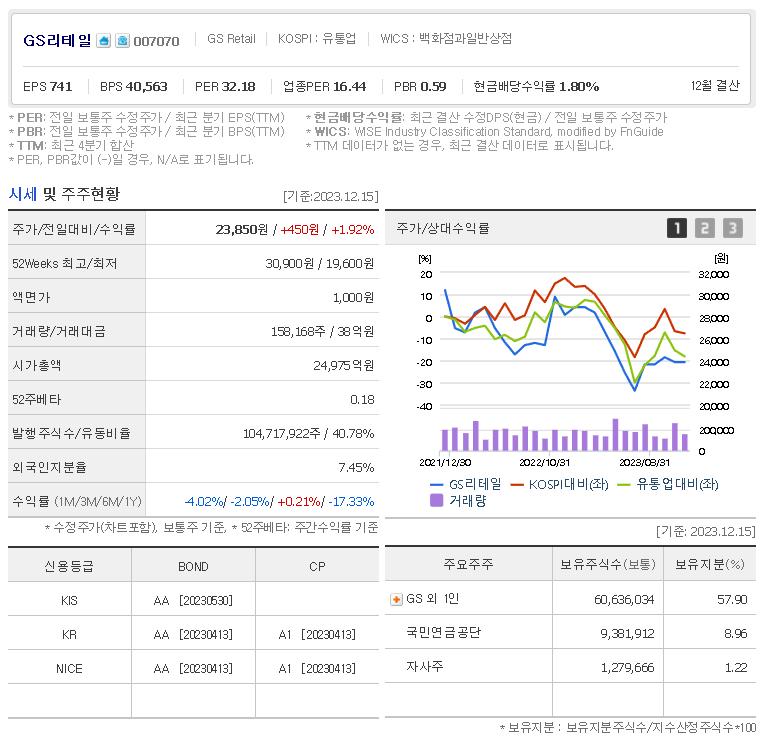 외국인 보유 비중은 158,168% 이며 장중 거래량은 104,717,922를 기록했습니다. 매출액은 87,482억 원, 영업이익은 2,451억 원을 달성했습니다. EPS는 1,808원이며 GS리테일 주식 배당수익률은 1.53% 입니다.