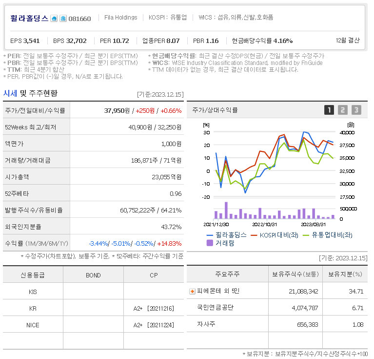 외국인 보유 비중은 186,871% 이며 장중 거래량은 60,752,222를 기록했습니다. 매출액은 32,458억 원, 영업이익은 4,351억 원을 달성했습니다. EPS는 2,141원이며 휠라홀딩스 주식 배당수익률은 23,055% 입니다.