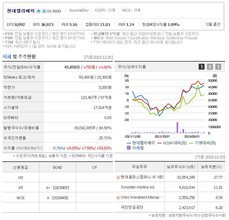 외국인 보유 비중은 123,467% 이며 장중 거래량은 39,092,385를 기록했습니다. 매출액은 18,989억 원, 영업이익은 430억 원을 달성했습니다. EPS는 없음원이며 현대엘리베이 주식 배당수익률은 1.77% 입니다.