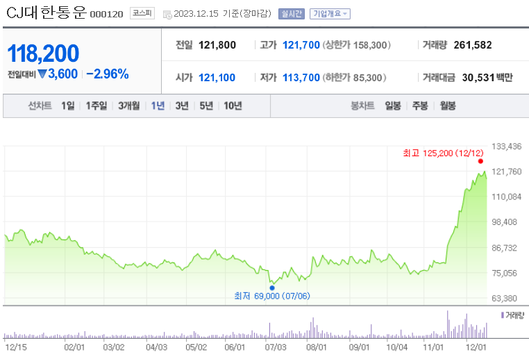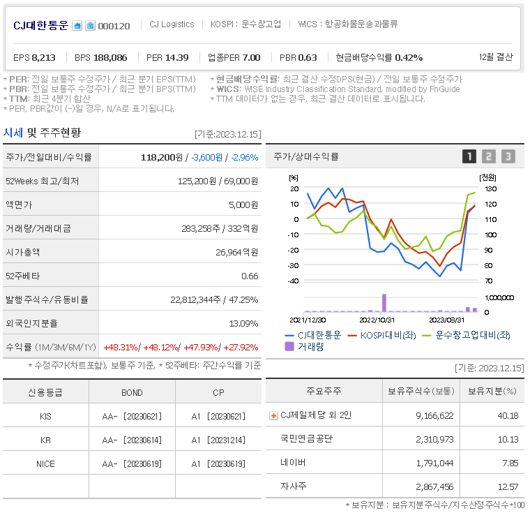 CJ대한통운 현재 주가는 118,200원이며 전일 대비 -3,600원의 모습을 보이고 있습니다. CJ대한통운의 주주현황을 살펴보면 CJ제일제당(외 2인)이 지분 40.18%를 소유하고 있습니다. CJ대한통운는 육상운수 기업으로 장중 기준으로 주가는 118,200원 입니다. 삼성전자의 시가 총액은 2조6964억 원이며 발행 주식수는 13.09주 입니다.