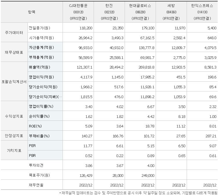 -2023년 6월 전년동기 대비 연결기준 매출액은 3.7% 감소, 영업이익은 10.2% 증가, 당기순이익은 11.2% 증가. 매출 감소에도 택배, 이커머스, CL사업의 견조한 성장으로인한 수익성 개선 및 원가 절감으로 이익규모 확대. 통합 배송솔루션 ‘오네’ 기반 서비스 다양화를 통하여 택배, 이커머스 물류 경쟁력 제고하고 CL 생산성 혁신프로젝트를 기반으로 성장성 확보 및 수익성 개선 추진 예정.