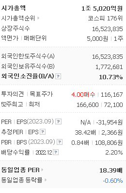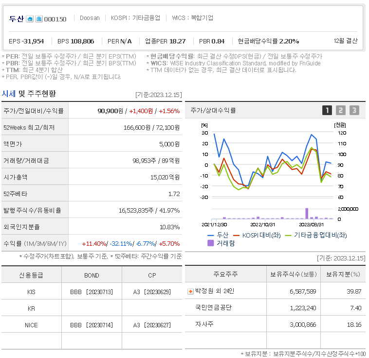 외국인 보유 비중은 98,953% 이며 장중 거래량은 16,523,835를 기록했습니다. 매출액은 138,582억 원, 영업이익은 11,260억 원을 달성했습니다. EPS는 2,366원이며 두산 주식 배당수익률은 2.41% 입니다.