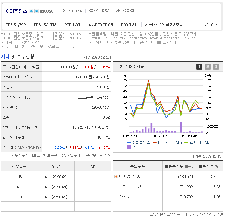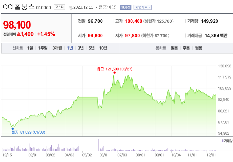 이 글에서는 OCI홀딩스 주가 전망과 목표 주가, 기업 정보에 대해서 설명합니다. 주식 거래에서 중요한 부분은 현재 기업 가치보다는 미래의 기업 가치를 예측하고 먼저 행동하는 것입니다. 투자할 종목을 고르기 전에 현재 기업의 상황과 지표를 살펴보는 것이 중요합니다. OCI홀딩스 주식의 주요 현황과 투자 정보를 확인하시고 주식 투자에 도움을 줄 자료들을 모아 두었으니 투자에 도움을 받으시길 바랍니다.