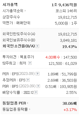 외국인 보유 비중은 150,394% 이며 장중 거래량은 19,812,715를 기록했습니다. 매출액은 20,041억 원, 영업이익은 9,767억 원을 달성했습니다. EPS는 36,520원이며 OCI홀딩스 주식 배당수익률은 3.89% 입니다.