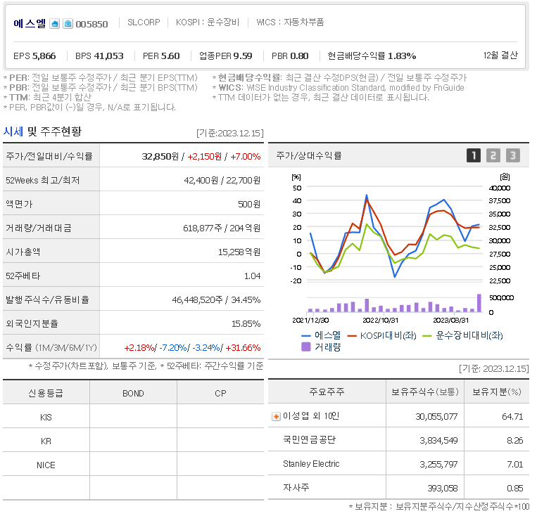 에스엘 현재 주가는 32,850원이며 전일 대비 -7.20원의 모습을 보이고 있습니다. 에스엘의 주주현황을 살펴보면 이성엽(외 10인)이 지분 64.71%를 소유하고 있습니다. 에스엘는 자동차부품 기업으로 장중 기준으로 주가는 32,850원 입니다. 에스엘 의 시가 총액은 1조5258억 원이며 발행 주식수는 15.85주 입니다.