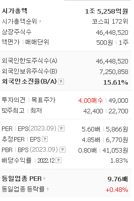 외국인 보유 비중은 618,877% 이며 장중 거래량은 46,448,520를 기록했습니다. 매출액은 36,480억 원, 영업이익은 1,979억 원을 달성했습니다. EPS는 6,770원이며 에스엘 주식 배당수익률은 2.61% 입니다.