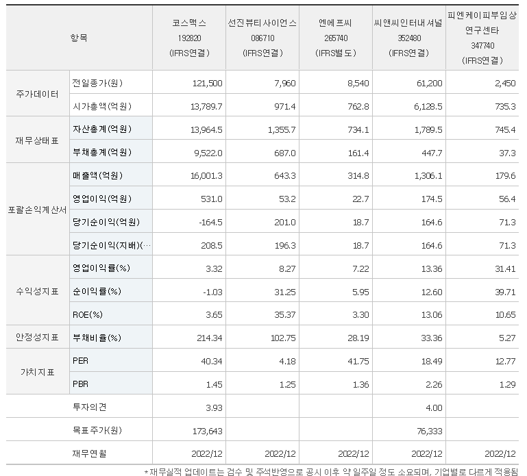 -2023년 6월 전년동기 대비 연결기준 매출액은 9.9% 증가, 영업이익은 93.3% 증가, 당기순이익은 38.8% 증가. 2분기 매출은 미국 이외 전 지역에서 두 자릿수 성장률을 달성했고, 특히 국내 법인의 실적이 좋았음. 8월 18일 장 종료 후 자회사 코스맥스이스트 유상감자 공시를 발표하였음. 감자 기준일은 9월 21일이며, 유상감자가 완료되면 코스맥스의 코스맥스이스트 지분율은 87.7%에서 97.17%로 확대.