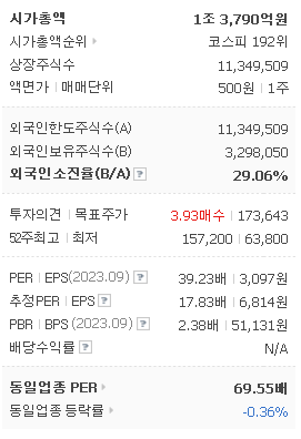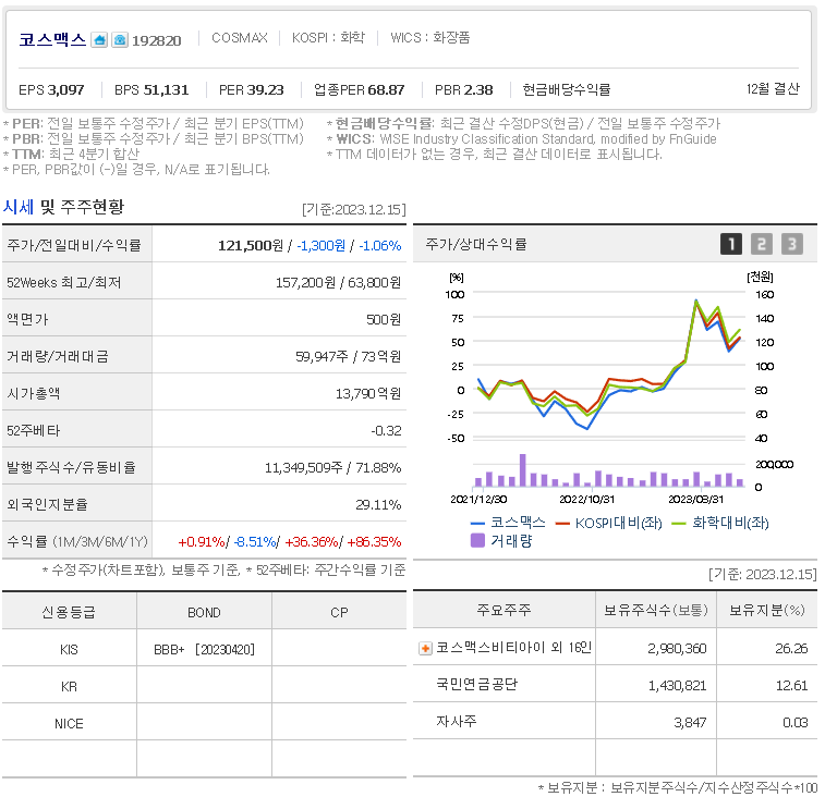외국인 보유 비중은 59,947% 이며 장중 거래량은 11,349,509를 기록했습니다. 매출액은 13,408억 원, 영업이익은 531억 원을 달성했습니다. EPS는 6,814원이며 코스맥스 주식 배당수익률은 % 입니다.