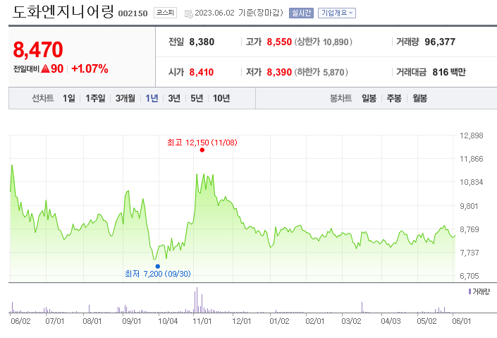 외국인 보유 비중은 96,777%이며 장중 거래량은 33,720,000를 기록했습니다. 매출액은 1,196억 원, 영업이익은 119억 원을 달성했습니다. EPS는 없음원이며 도화엔지니어링 주식 배당수익률은 1.42%입니다.