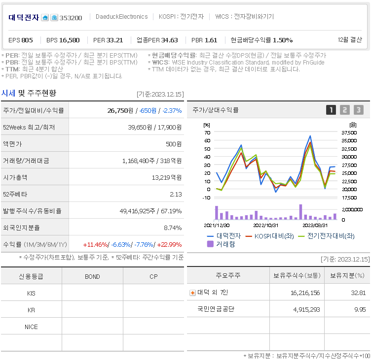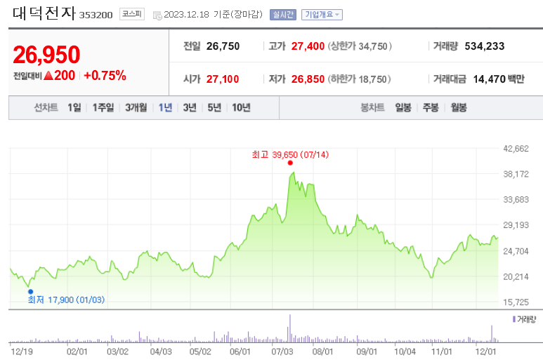 외국인 보유 비중은 1,168,475% 이며 장중 거래량은 49,416,925를 기록했습니다. 매출액은 6,753억 원, 영업이익은 2,325억 원을 달성했습니다. EPS는 583원이며 대덕전자 주식 배당수익률은 2.12% 입니다.