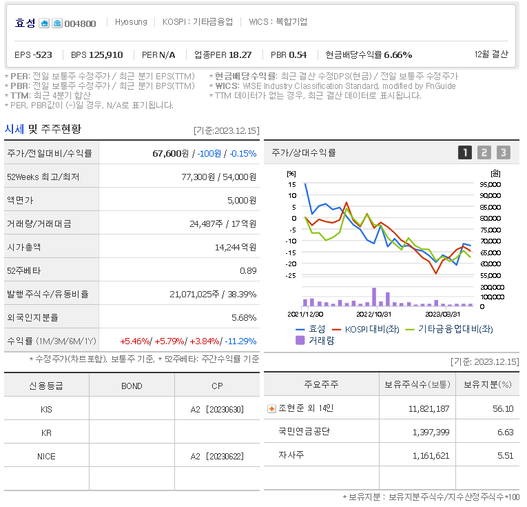효성 현재 주가는 67,600원이며 전일 대비 -100원의 모습을 보이고 있습니다. 효성의 주주현황을 살펴보면 조현준(외 14인)이 지분 56.10%를 소유하고 있습니다. 효성는 복합 산업 기업으로 장중 기준으로 주가는 67,600원 입니다. 효성의 시가 총액은 1조4054억 원이며 발행 주식수는 5.68주 입니다.