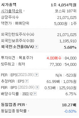 외국인 보유 비중은 24,487% 이며 장중 거래량은 21,071,025를 기록했습니다. 매출액은 25,119억 원, 영업이익은 649억 원을 달성했습니다. EPS는 1,076원이며 효성 주식 배당수익률은 6.71% 입니다.