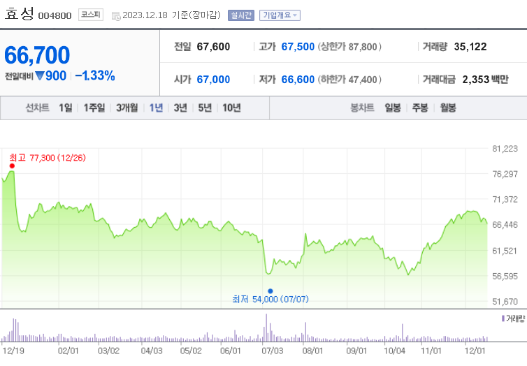 이 글에서는 효성 주가 전망과 목표 주가, 기업 정보에 대해서 설명합니다. 주식 투자에서 핵심은 미래의 기업 가치를 예상하고 선제적으로 움직이는 것입니다. 투자 대상을 결정하기 전에 현재 기업의 현황과 수치를 검토하는 것이 필요합니다. 효성 주식의 주요 현황과 투자 정보를 확인하시고 주식 투자에 도움을 줄 자료들을 모아두었으니 참고하여 효율적인 투자를 해보세요.