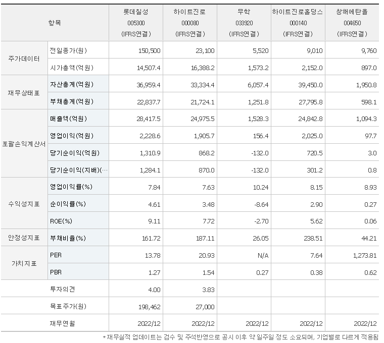 -2023년 6월 전년동기 대비 연결기준 매출액은 6.3% 증가, 영업이익은 4.1% 감소, 당기순이익은 19.2% 감소. 동사의 탄산음료 매출 중 최근 건강 및 다이어트에 대한 소비자 관심 증가로 제로 칼로리 탄산음료 수요가 크게 증가하고 있음. 기존 소주 제품인 '처음처럼' 리뉴얼을 진행하였고, 제로슈거 소주 제품인 '처음처럼 새로'를 출시, 각 제품의 특성에 맞게 포지셔닝하여 시장을 공략중임.