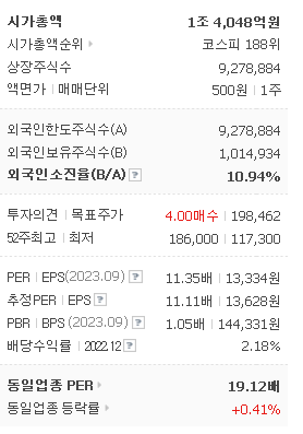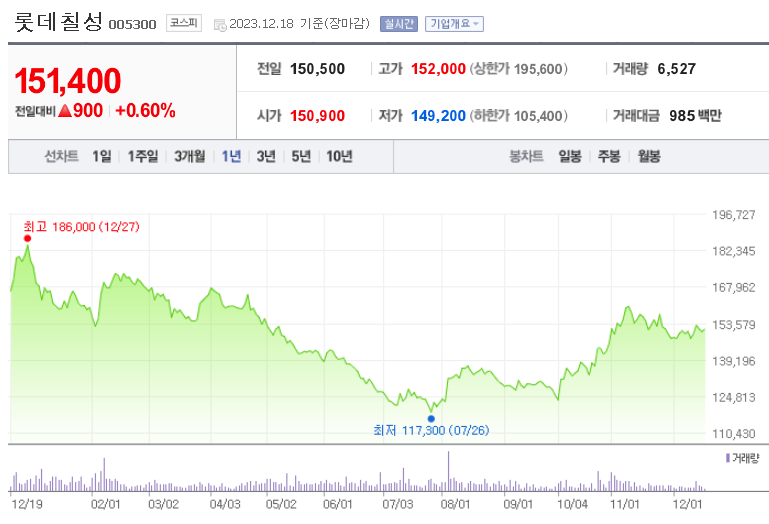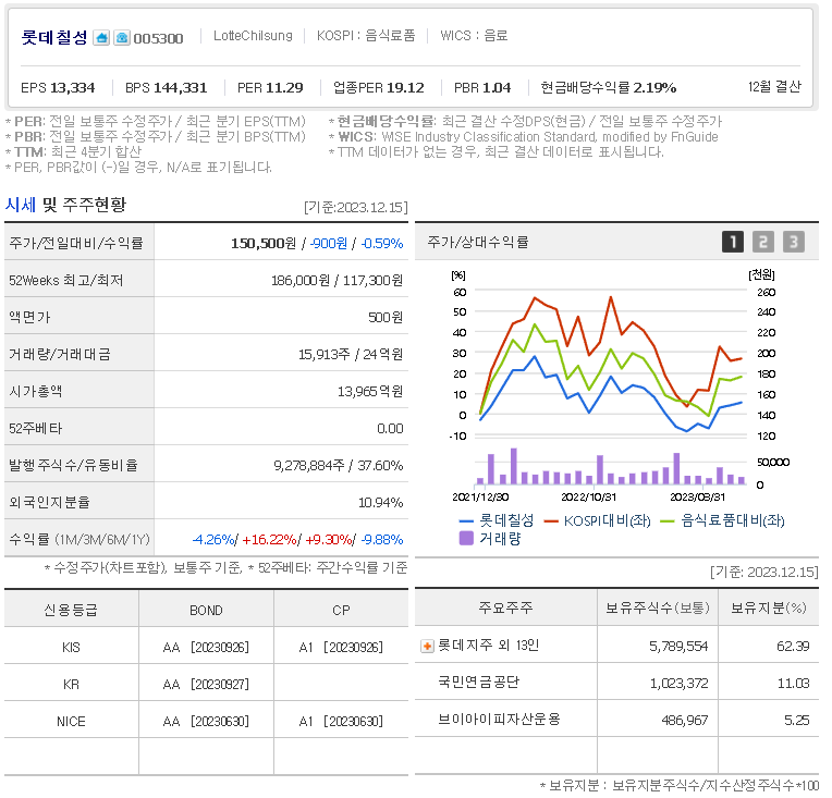 외국인 보유 비중은 15,913% 이며 장중 거래량은 9,278,884를 기록했습니다. 매출액은 23,063억 원, 영업이익은 2,229억 원을 달성했습니다. EPS는 13,628원이며 롯데칠성 주식 배당수익률은 1.88% 입니다.