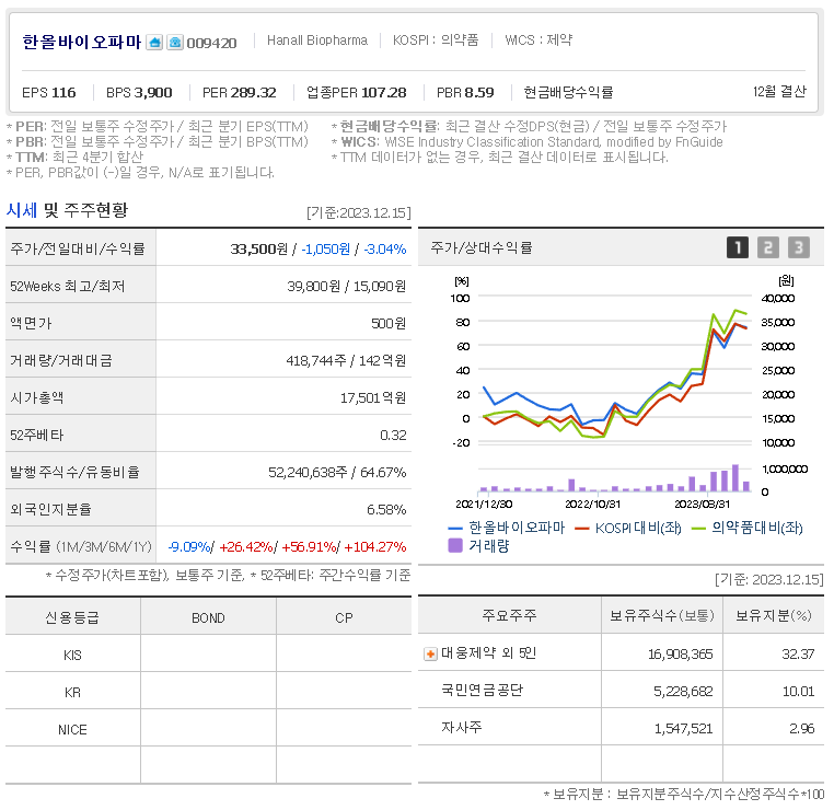 외국인 보유 비중은 418,744% 이며 장중 거래량은 52,240,638를 기록했습니다. 매출액은 1,032억 원, 영업이익은 15억 원을 달성했습니다. EPS는 157원이며 한올바이오파마 주식 배당수익률은 0.85% 입니다.