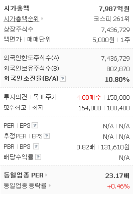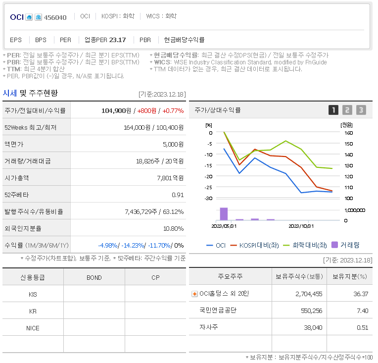 외국인 보유 비중은 18,826% 이며 장중 거래량은 7,436,729를 기록했습니다. 매출액은 7,943억 원, 영업이익은 억 원을 달성했습니다. EPS는 6,723원이며 OCI 주식 배당수익률은 % 입니다.