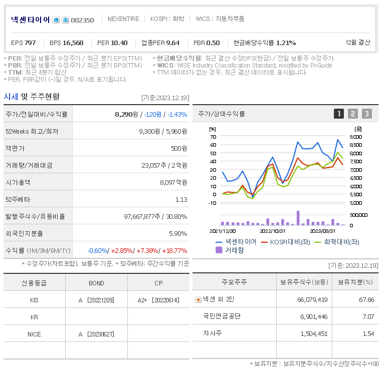 외국인 보유 비중은 23,057% 이며 장중 거래량은 97,667,877를 기록했습니다. 매출액은 20,236억 원, 영업이익은 -543억 원을 달성했습니다. EPS는 1,313원이며 넥센타이어 주식 배당수익률은 1.23% 입니다.