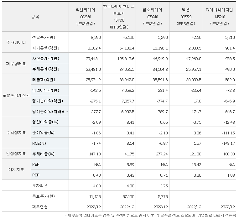 -2023년 6월 전년동기 대비 연결기준 매출액은 12.2% 증가, 영업이익 흑자전환, 당기순이익 흑자전환. 타이어제품 관련 매출이 국내외에서 고르게 증가함에 따라 흑자전환에 성공함. 해외 지법인 확대를 통한 글로벌 영업망 구축을 활발히 진행하고 창녕공장 및 유럽공장 등을 통하여 국내 업체는 물론 포르쉐/폭스바겐/아우디 등에 타이어 공급을 지속적으로 확대해 나가고 있음.