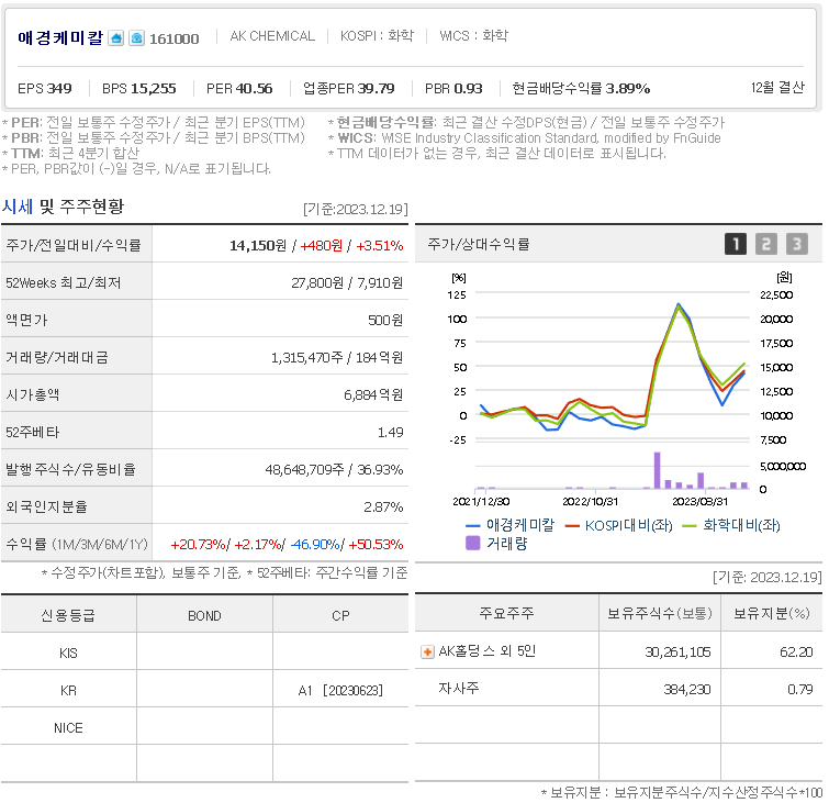외국인 보유 비중은 1,315,467% 이며 장중 거래량은 48,648,709를 기록했습니다. 매출액은 13,719억 원, 영업이익은 951억 원을 달성했습니다. EPS는 637원이며 애경케미칼 주식 배당수익률은 6,884% 입니다.