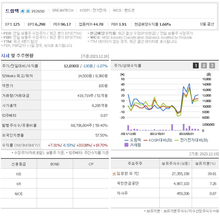 외국인 보유 비중은 419,719% 이며 장중 거래량은 68,706,804를 기록했습니다. 매출액은 7,823억 원, 영업이익은 967억 원을 달성했습니다. EPS는 416원이며 드림텍 주식 배당수익률은 2.20% 입니다.
