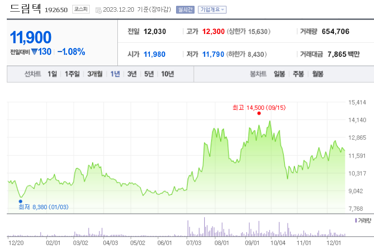 드림텍 현재 주가는 12,030원이며 전일 대비 -130원의 모습을 보이고 있습니다. 드림텍의 주주현황을 살펴보면 임창완(외 7인)이 지분 39.81%를 소유하고 있습니다. 드림텍는 휴대폰 및 관련부품 기업으로 장중 기준으로 주가는 12,030원 입니다. 드림텍의 시가 총액은 8176억 원이며 발행 주식수는 57.50주 입니다.