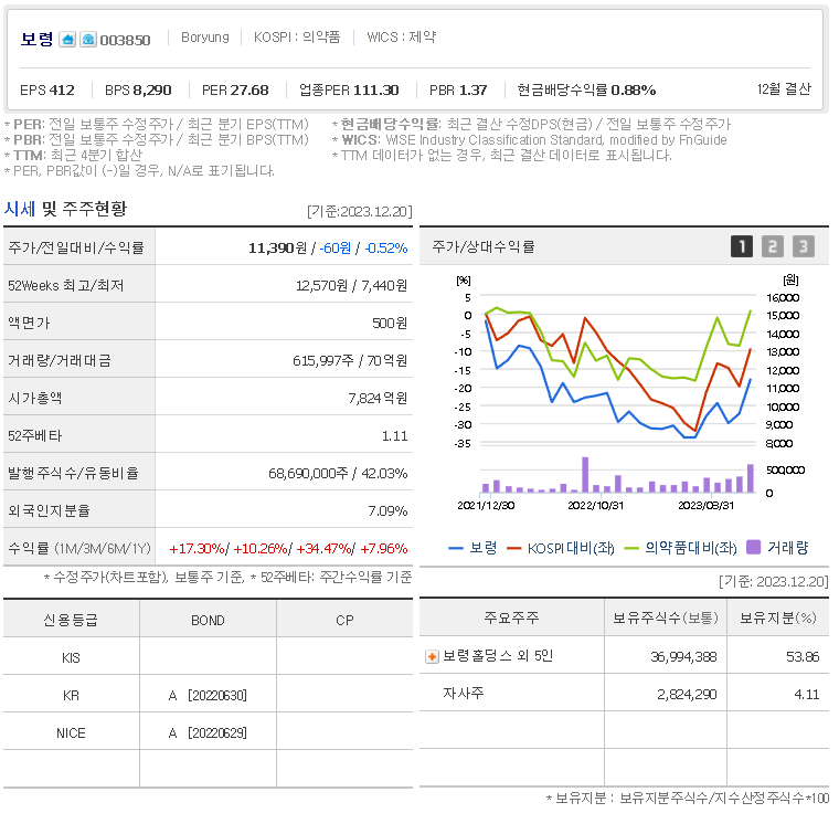 보령 현재 주가는 11,390원이며 전일 대비 -60원의 모습을 보이고 있습니다. 보령의 주주현황을 살펴보면 보령홀딩스 주주가 전체 지분 53.86%를 소유하고 있습니다. 보령는 제약 기업으로 장중 기준으로 주가는 11,390원 입니다. 보령의 시가 총액은 7769억 원이며 발행 주식수는 68,690,000주 입니다.