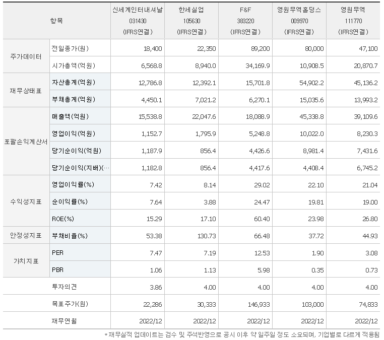 -2023년 6월 전년동기 대비 연결기준 매출액은 12.2% 감소, 영업이익은 60.1% 감소, 당기순이익은 53% 감소. 동사는 유통망 확대, 유통채널 다변화, 신규사업 진출을 통한 외형확대와 신규 브랜드의 발굴과 확보를 통한 시장경쟁력 강화, 판매 및 할인율 재정립 등을 추진 중임, 매출액은 전년 동기 대비 10%넘게 하락하였으며 인건비 등의 비용 증가로 영업이익이 감소함.
