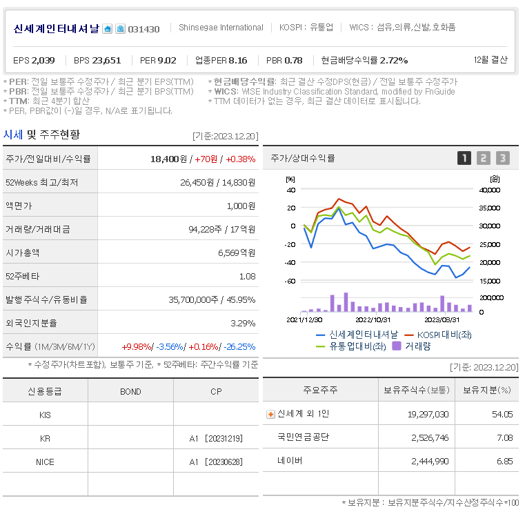 신세계인터내셔날 현재 주가는 18,400원이며 전일 대비 -3.56원의 모습을 보이고 있습니다. 신세계인터내셔날의 주주현황을 살펴보면 신세계 주주가 전체 지분 54.05%를 소유하고 있습니다. 신세계인터내셔날는 섬유 및 의복 기업으로 장중 기준으로 주가는 18,400원 입니다. 신세계인터내셔날의 시가 총액은 6558억 원이며 발행 주식수는 35,700,000주 입니다.