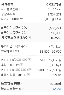 외국인 보유 비중은 8.25% 이며 장중 거래량은 6,173원 을 기록했습니다. 매출액은 24,263억 원을 달성했습니다. EPS는 없음원이며 삼양홀딩스 주식 배당수익률은 2.22% 입니다.