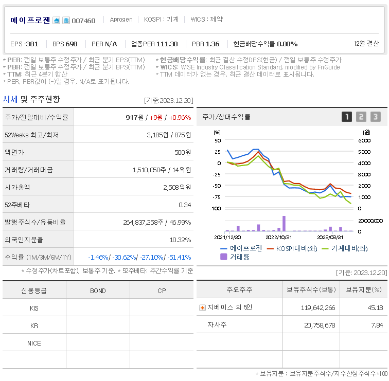외국인 보유 비중은 10.32% 이며 장중 거래량은 1,510,051원 을 기록했습니다. 매출액은 1,132억 원을 달성했습니다. EPS는 없음원이며 에이프로젠 주식 배당수익률은 -763.00% 입니다.