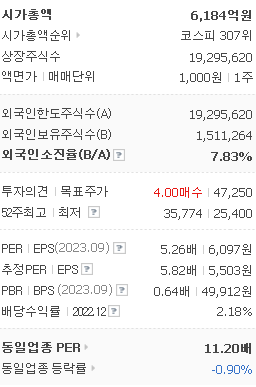 외국인 보유 비중은 7.83% 이며 장중 거래량은 35,324원 을 기록했습니다. 매출액은 33,403억 원을 달성했습니다. EPS는 5,503원이며 동원F&B 주식 배당수익률은 20,903,516% 입니다.