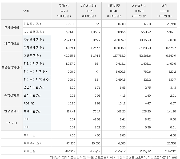 -2023년 6월 전년동기 대비 연결기준 매출액은 11.5% 증가, 영업이익은 29.7% 증가, 당기순이익은 31.4% 증가. 향후 식품사업은 1인가구, 맞벌이 가구 증가 및 인구 구조 변화로 급격한 트렌드 변화가 지속될 것으로 예상되며, 이러한 변화에 선제적으로 대응하여 새로운 미래 먹거리 및 성장 기반을 구축할 예정. 2022년 8월에는 펫사업을 더욱 강화시키고자 아르르를 인수하여 양적, 질적 성장을 이룰 것으로 기대하고 있음.