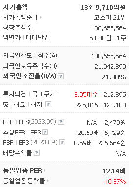 외국인 보유 비중은 21.85% 이며 장중 거래량은 259,761원 을 기록했습니다. 매출액은 577,592억 원을 달성했습니다. EPS는 6,786원이며 SK이노베이션 주식 배당수익률은 0.00% 입니다.