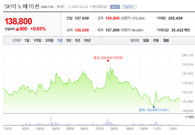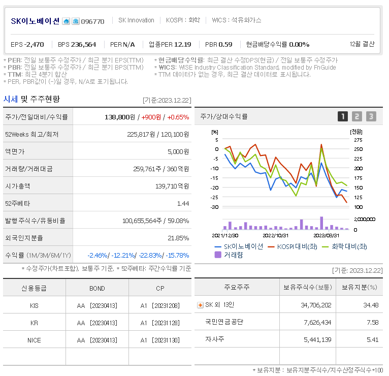 SK이노베이션 현재 주가는 138,800원이며 전일 대비 -2.46원의 모습을 보이고 있습니다. SK이노베이션의 주주현황을 살펴보면 SK 주주가 전체 지분 34.48%를 소유하고 있습니다. SK이노베이션는 석유 및 가스 기업으로 장중 기준으로 주가는 138,800원 입니다. SK이노베이션의 시가 총액은 13조9710억 원이며 발행 주식수는 100,655,564주 입니다.