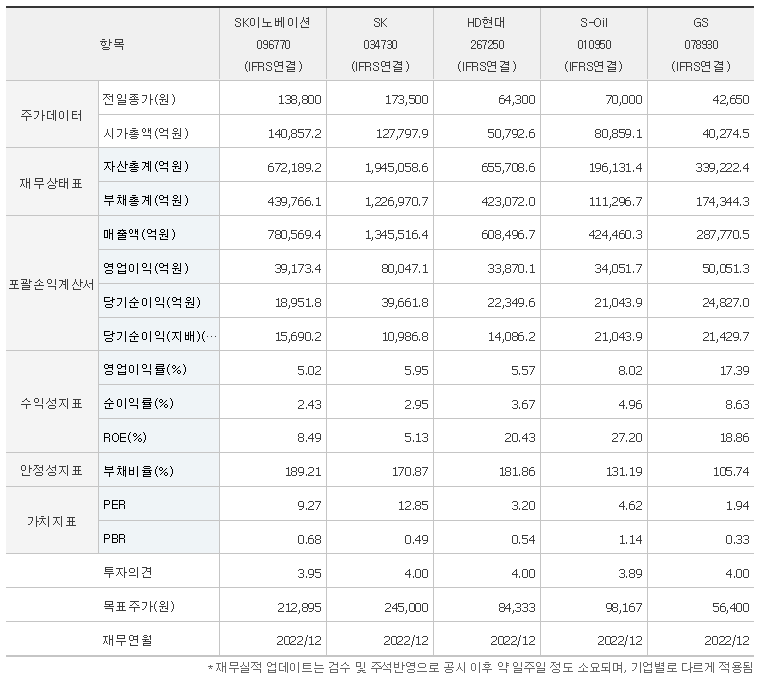 -2023년 6월 전년동기 대비 연결기준 매출액은 4.7% 증가, 영업이익은 97.5% 감소, 당기순이익 적자전환. 석유 사업 부문 정제마진 하락 및 재고관련 손실로 실적 부진. SK온은 적자폭 축소 및 미국 공장 가동률 및 수율이 개선되고 있고 출하량도 성장 중. 유럽 전기차 판매 둔화에 따른 우려가 있으나, 고객사의 견조한 수요로 SK온은 전년대비 매출 2배 성장 가능할 전망임.