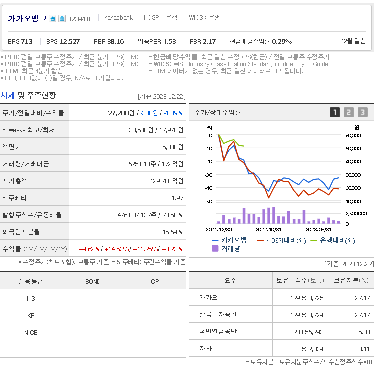 카카오뱅크 현재 주가는 27,200원이며 전일 대비 -300원의 모습을 보이고 있습니다. 카카오뱅크의 주주현황을 살펴보면 카카오 주주가 전체 지분 27.17%를 소유하고 있습니다. 카카오뱅크는 상업은행 기업으로 장중 기준으로 주가는 27,200원 입니다. 카카오뱅크의 시가 총액은 12조9700억 원이며 발행 주식수는 476,837,137주 입니다.