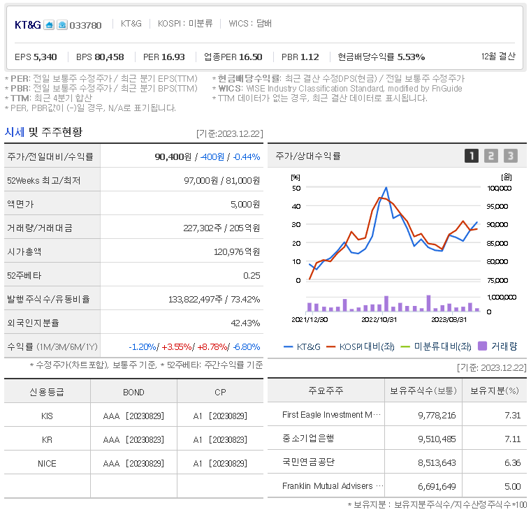 이 글에서는 KT&G 주가 전망과 목표 주가, 기업 정보에 대해서 설명합니다. 주식 거래에서 중요한 부분은 현재 기업 가치보다는 미래의 기업 가치를 예측하고 먼저 행동하는 것입니다. 투자할 종목을 고르기 전에 현재 기업의 상황과 지표를 살펴보는 것이 중요합니다. KT&G 주식의 주요 현황과 투자 정보를 확인하시고 주식 투자에 도움을 줄 자료들을 모아 두었으니 투자 결정에 도움을 받으시길 바랍니다.