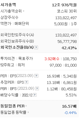 외국인 보유 비중은 42.43% 이며 장중 거래량은 227,302원 을 기록했습니다. 매출액은 44,212억 원을 달성했습니다. EPS는 6,861원이며 KT&G 주식 배당수익률은 5.46% 입니다.